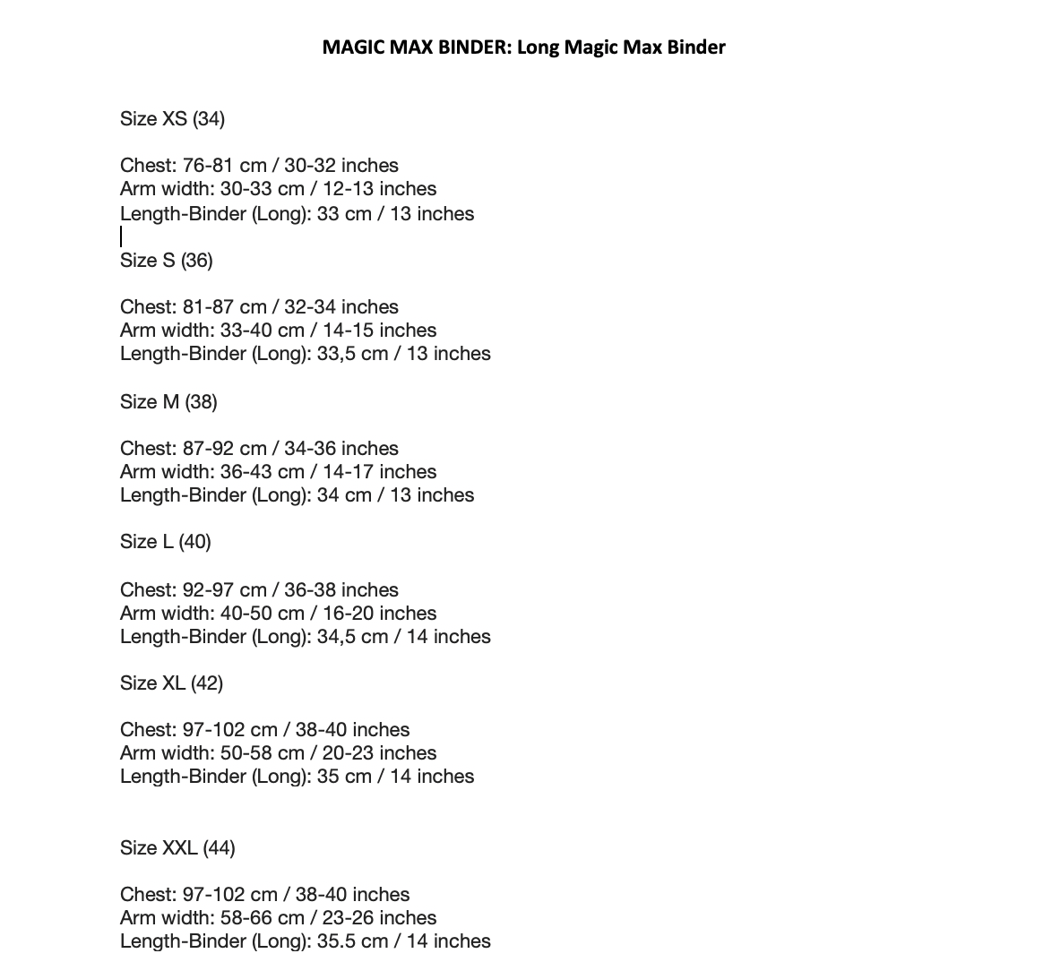 We have two types of Magic Max Binder; Short Magic Max Binder and Long Magic Max Binder. The Long Magic Max Binder Sizes are not full length but measure approximately 3 inches longer than their counterparts and are ideal for tall people, people with low sitting chests and those requiring more coverage.